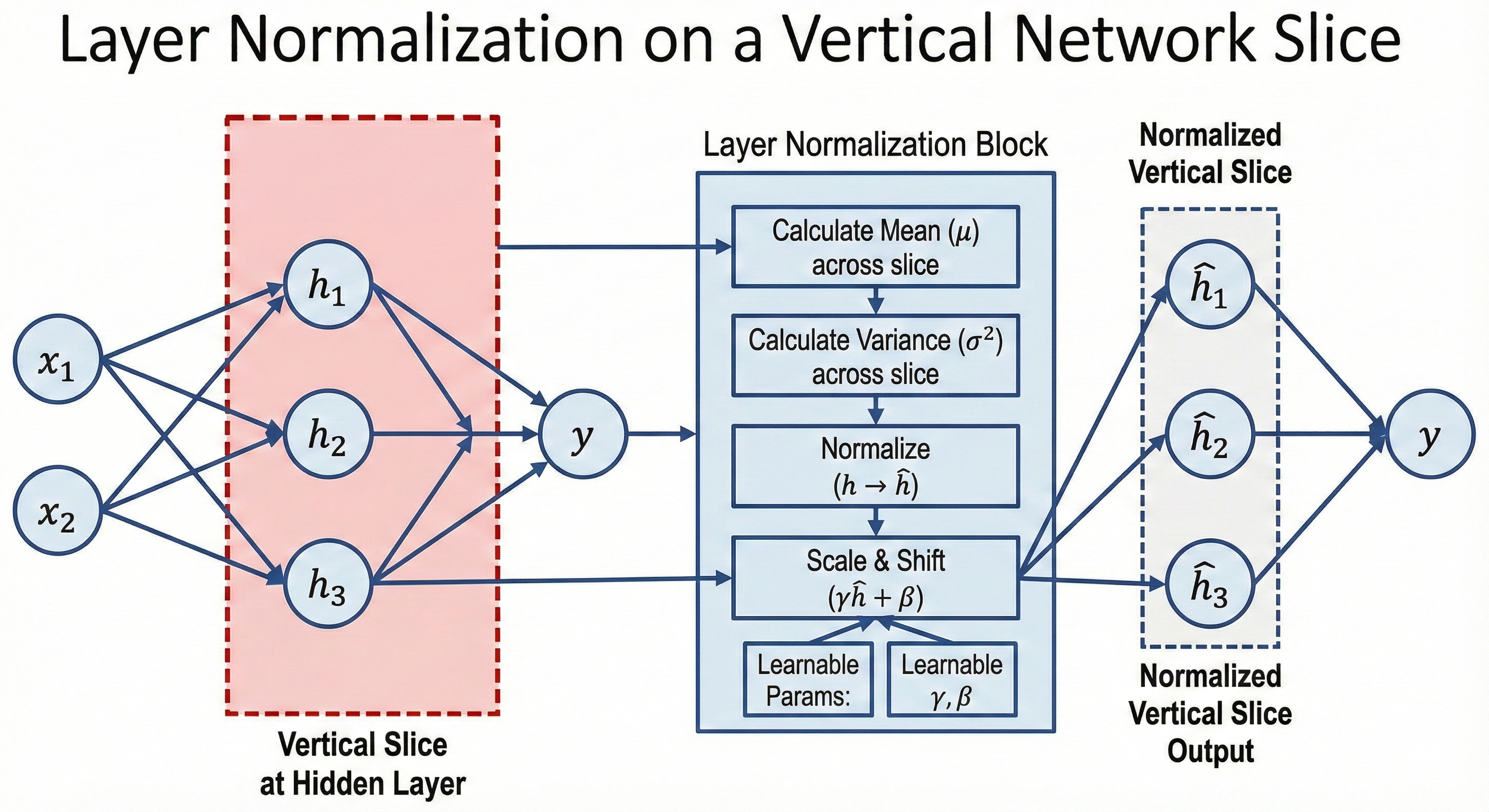 \[\sigma^2 = \frac{1}{H} \sum_{j=1}^{H} (x_j - \mu)^2\]Step C: Normalize ($\hat{x}$)