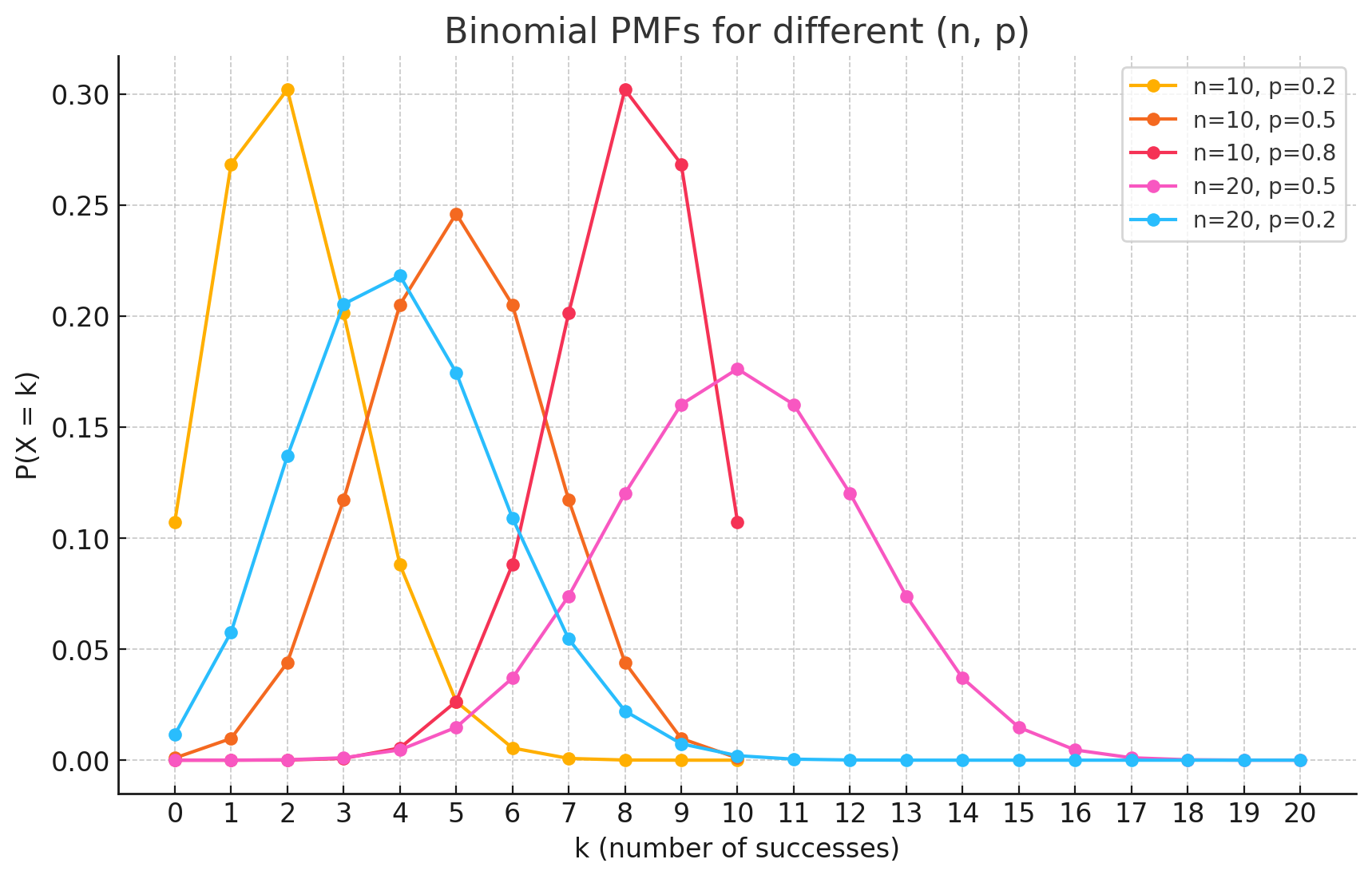 - k is the number of successes ($0, 1, 2, …, n$).