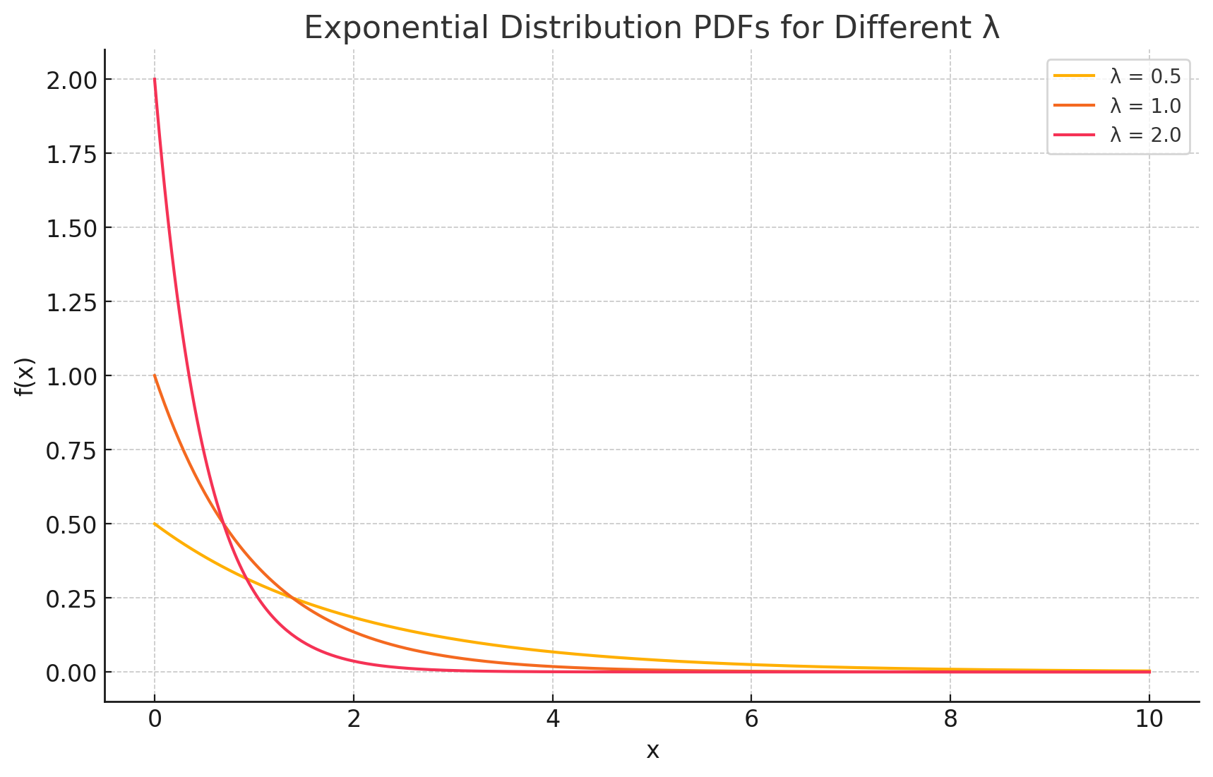 Customer Service: The exponential distribution can model the time between consecutive customer arrivals at a call center. If a center receives an average of 10 calls per hour ($\lambda=10$), the average time between calls would be $1/\lambda = 1/10$ of an hour, or 6 minutes. This helps in staffing and resource allocation.