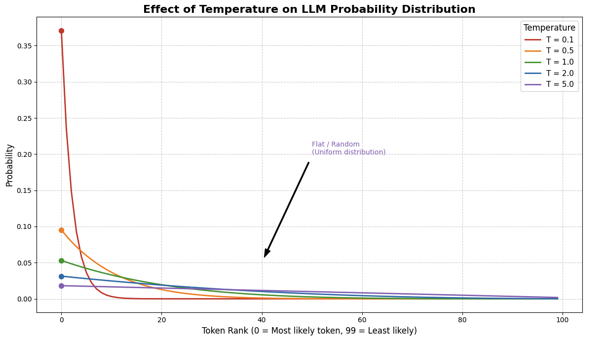 - Because the rank order is preserved, the exact same $K$ tokens will make up the candidate pool whether $T=0.1$ or $T=100$. Temperature dictates how the probability is distributed among those K tokens, but it doesn’t invite any new tokens to the party.