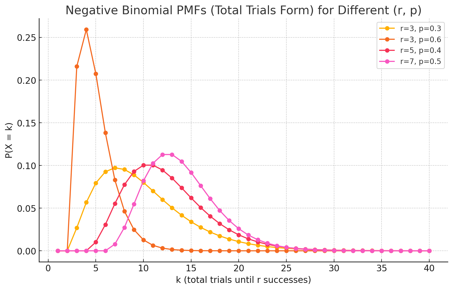 - The “Waiting Time” Distribution: It models the number of trials ($k$) required to achieve a fixed number of successes ($r$). This is the opposite of the Binomial distribution, where you have a fixed number of trials and count the successes.